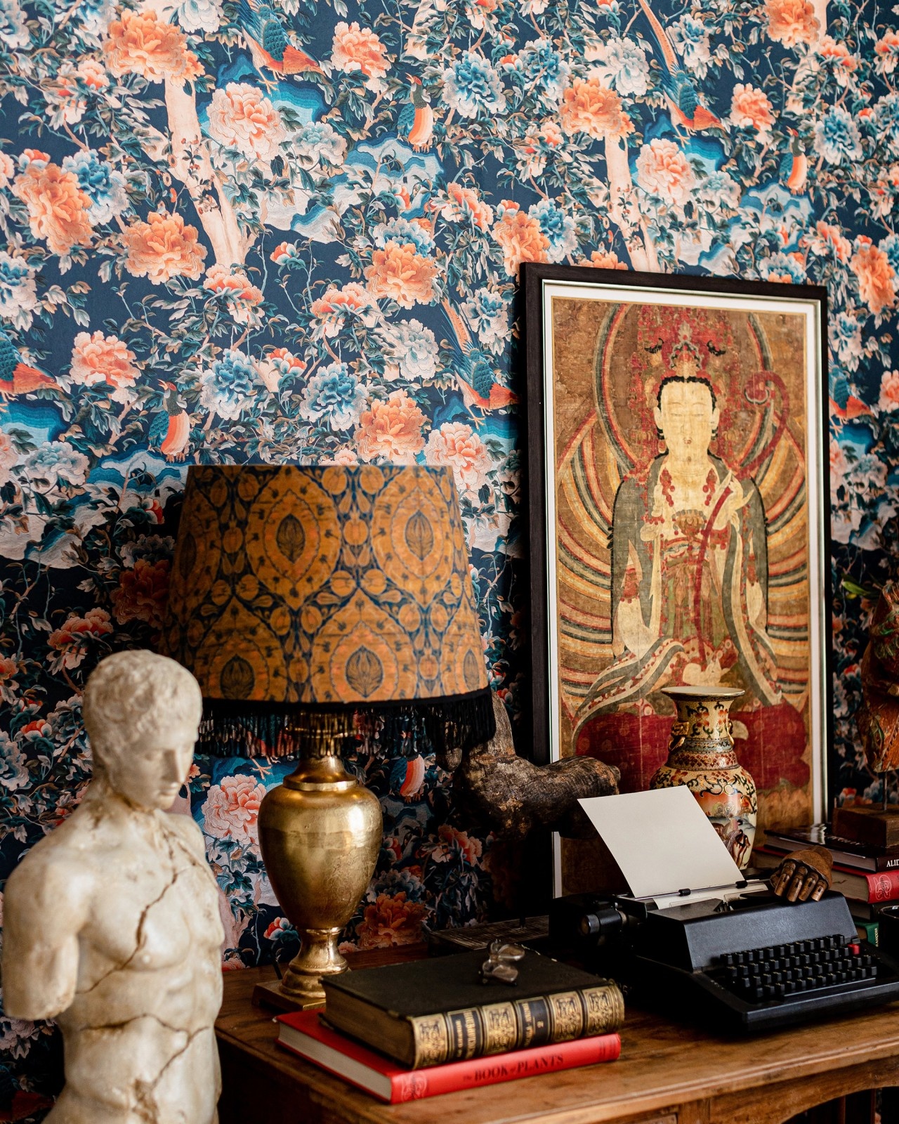 Glide through the gates of this blossom night, detailed down to the tiniest stems and petals. A MANCHURIAN NIGHT is a spectacle of colors and intricate shapes, with a jubilant composition captured on a beautiful full moon night. Atmospheric and inviting, the pattern resumes soft floral shapes against an intense blue background, while beacons of golden and orange hues brighten up the entire canvas. Perfect for artistic and precious interiors, this wallpaper evokes the magical feeling of China's blessed nature wherever it is displayed.