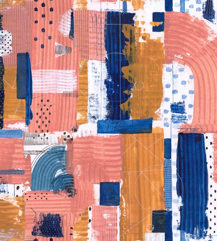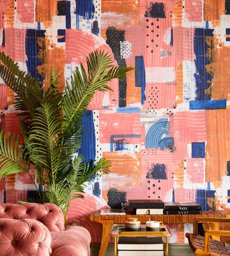 Mixing the pink, dark blue and pale brownish in sweet but bitter shades with contrasting graphic elements makes this wallpaper a strong and faithful interpretation of the glamorous 60’s.