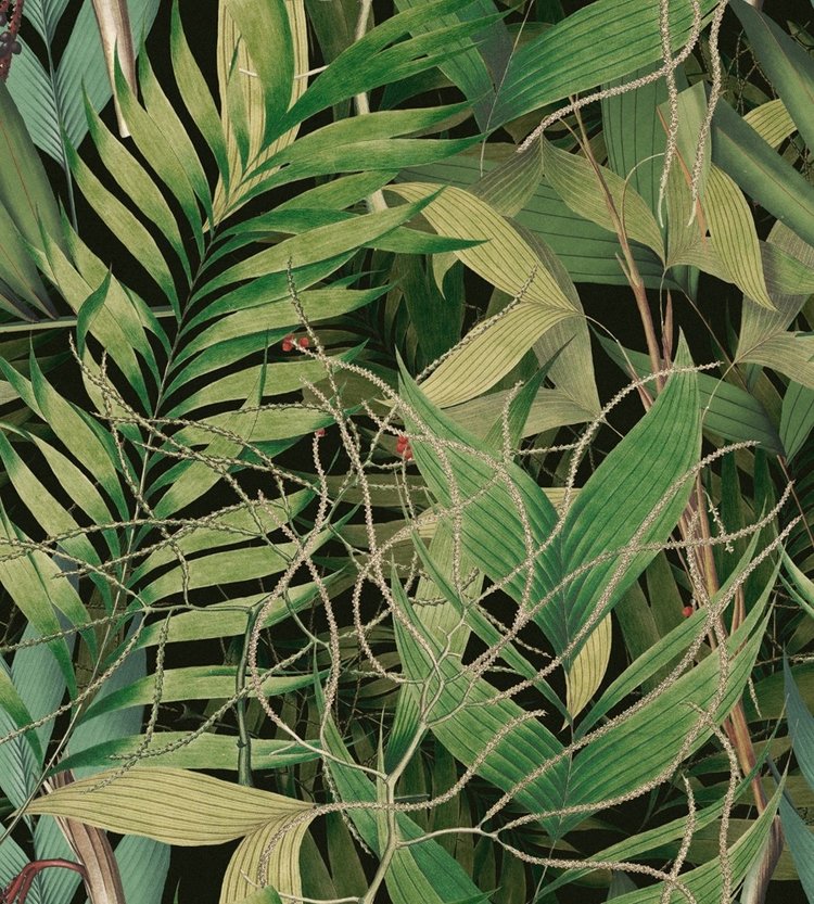 Exotic Garden is an extravagant green wallpaper with spectacular details of leaves and tropical vegetation. The amount of lush greenery against the dark background recreates the feeling of a deep tropical rainforest.