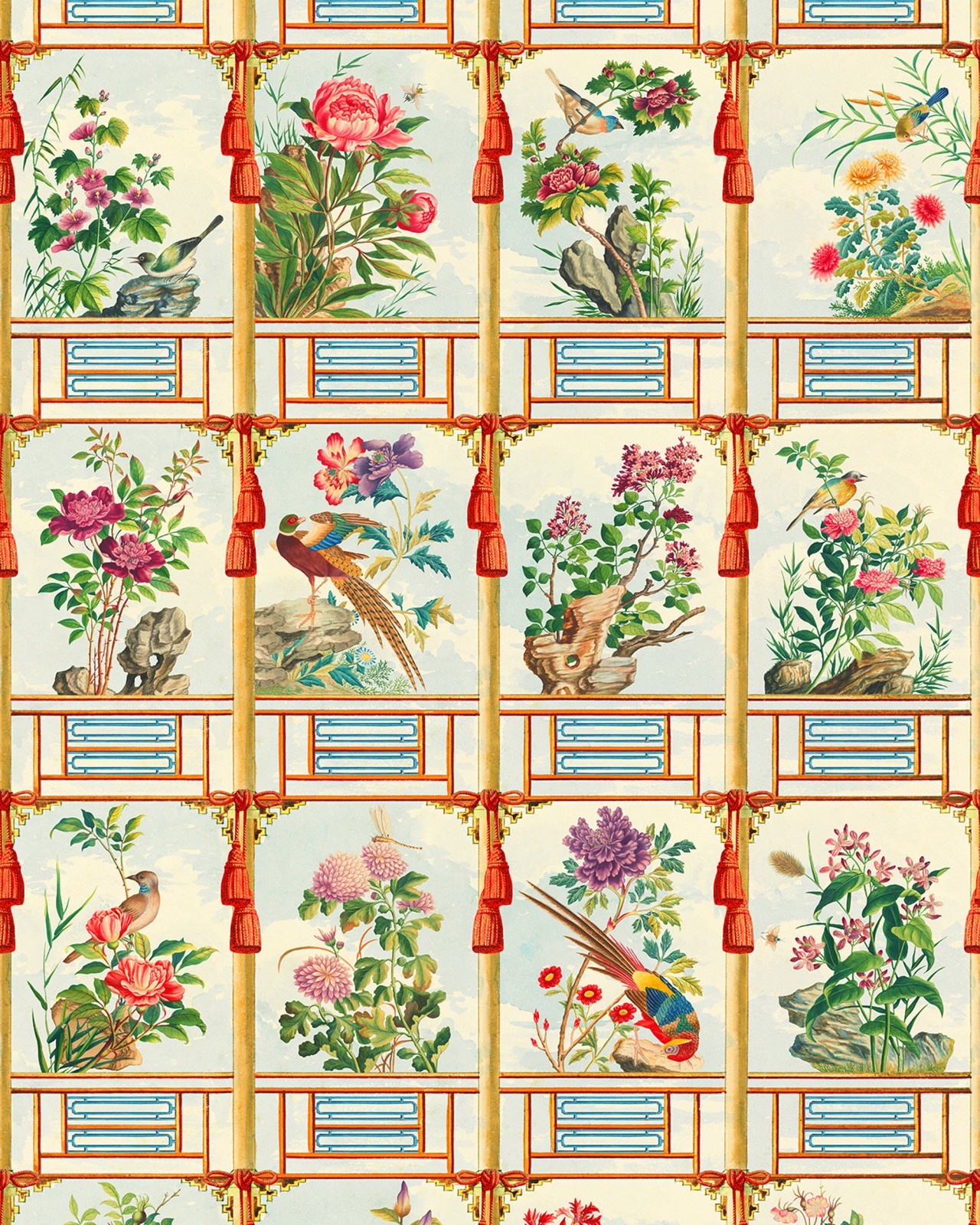 With a romantic, blooming charm, the FLOWERING WALL wallpaper is not only a beautiful background for your living spaces, but also a unique wall art in itself. Flowers, birds and specific Asian landscapes are depicted in each individual drawing that has its own special character, creating a natural perspective of an imaginary outdoor structure. Refined and visually coordinated, each grid is decorated with a red tassel knot, for luck and luck, making for a harmonious image.