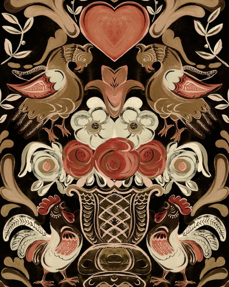 Goldene Henne is a wallpaper inspired by figures from traditional Tyrolean folklore. This wallcovering from Mind the Gap from the Tyrol Apres-Ski collection has an exuberant pattern full of golden roosters, impressive flowers and ruby red hearts. A vintage wallpaper that is perfect for a timeless, atmospheric and warm interior.