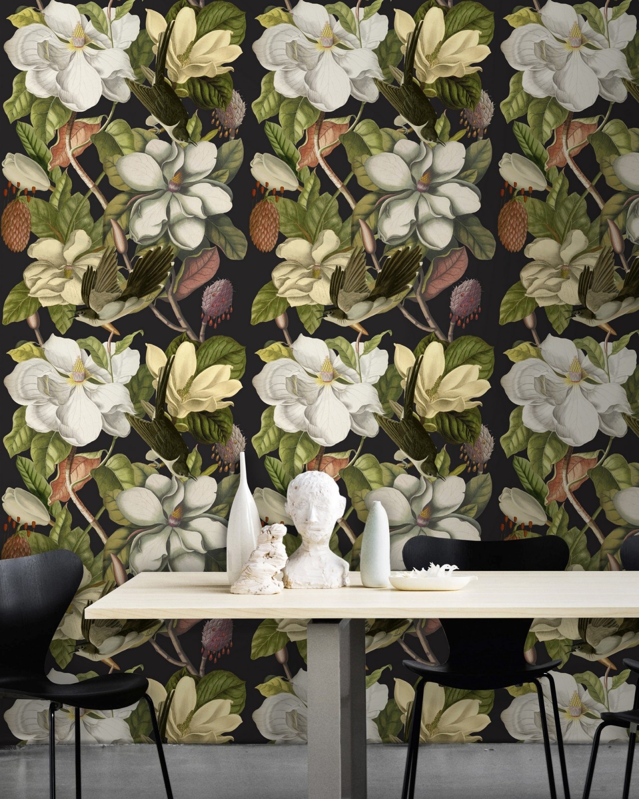 An impressive floral wallpaper with large size magnolia flowers on a black background, which can create a wall full of color and mystery.