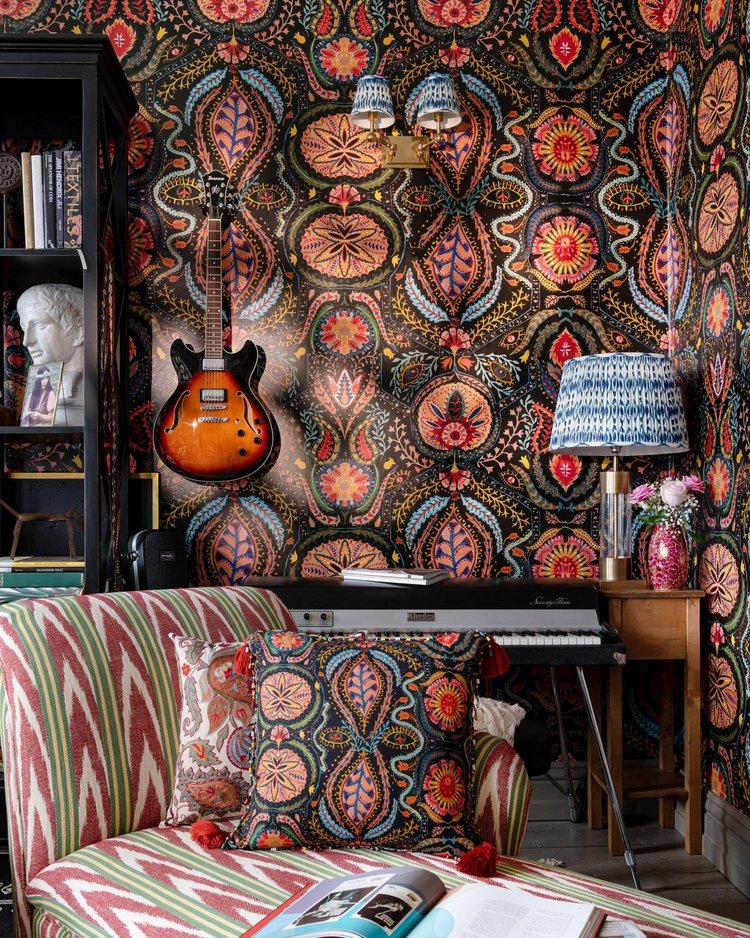 Reminiscent of the complexity of the paisley and psychedelic prints of the 1960s, SOUL SACRIFICE draws you into an enchanting world of color and depth. The eye is swept away into the dark background and you get lost among the organic shapes that meander across the surface, illuminating the walls like stars in a night sky. Eyes seem to peer at you among glowing branches positioned around larger central motifs, watching as you take in the intensity of pattern and color unfolding before you.