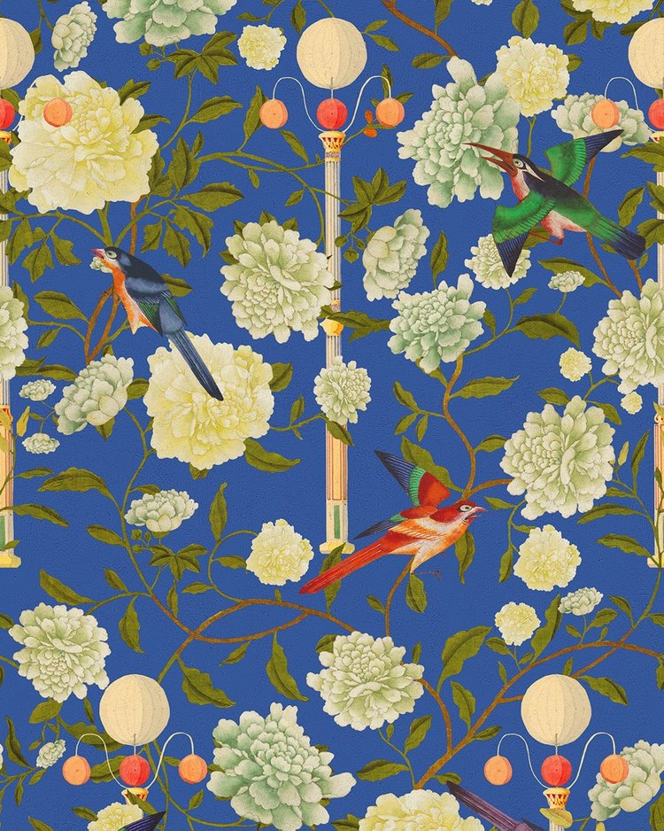 With meticulous Chinese trinkets and symbols in its design, THE GARDEN OF IMMORTALITY wallpaper has both character and long-lasting enchanting appeal. Inspired by ancient Eastern stories, blossoms and stems come together with colorful birds, in a timeless floral pattern. Created on a celestial blue background, the entire design is a true statement of royalty and honour, eternal wisdom and truth.