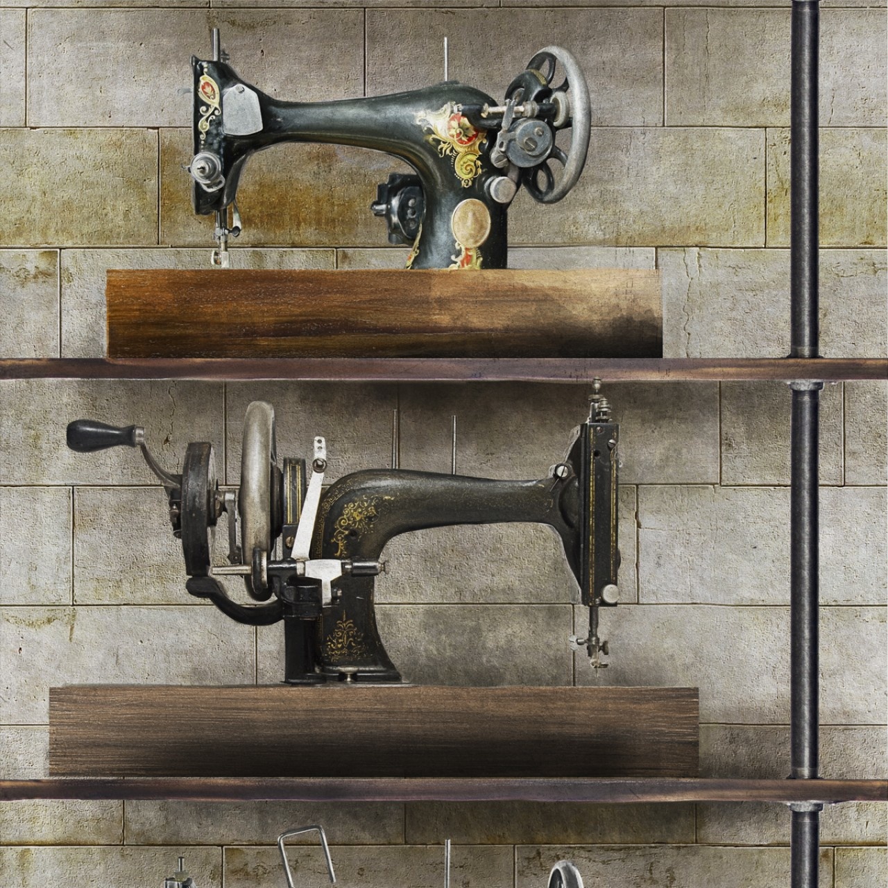 An impressive collection of precious vintage sewing machines, which can transpose you in the industrial universe of a factory. The design is printed over 3 rolls.