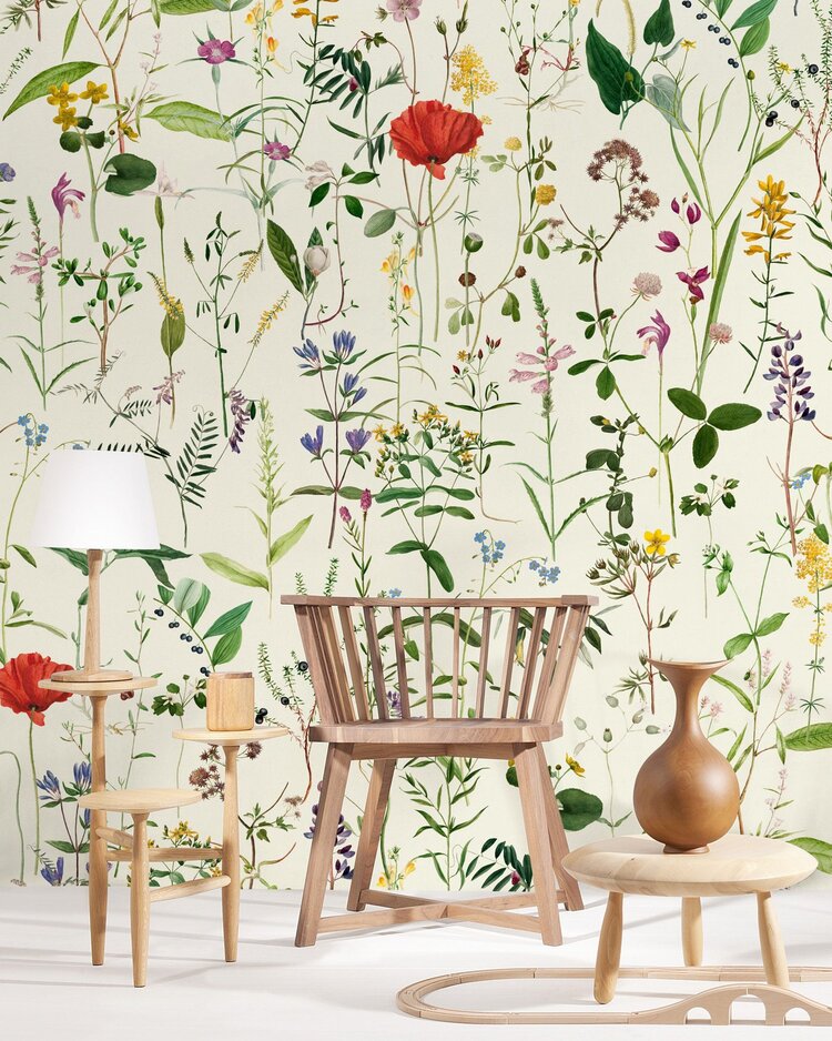 The AQUAFLEUR wallpaper by Mind the Gap features a cheerful mix of vintage floral illustrations set against a white, teal, or anthracite background. Think poppies, cornflowers, and bluebells in soft shapes and fresh colors. This wall covering fits perfectly in romantic, country, bohemian, or classic interiors, and its colorful flowers add a fresh, elegant, and natural touch to any space.
