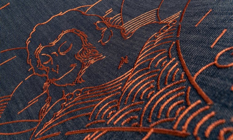Material: textile wallcovering made of denim, with colored embroidery