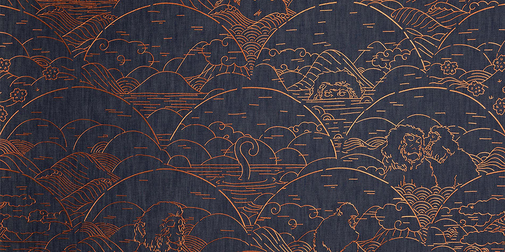 The fabric used for this special wall covering is one of Japanese denim. And the monkey pattern is processed with embroidery machines. This makes the design really 'on' the jeans fabric, and it has a beautiful structure.
