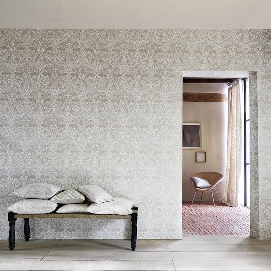 The wallpaper Morris Pure Brer Rabbit has been reproduced, using special printing techniques such as grit and mica. This printing technique gives texture to this two-tone wallpaper. There are also rabbits on the classic wallpaper