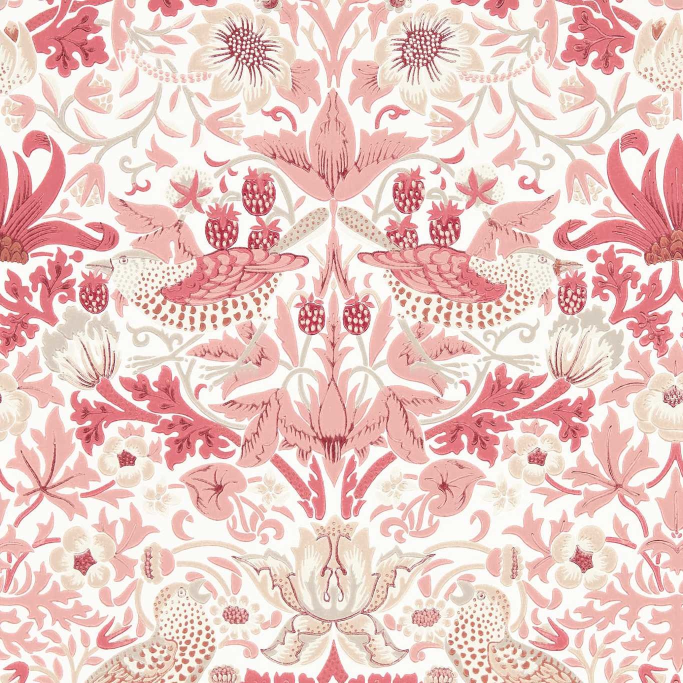 Simply Strawberry is a timeless wallpaper inspired by summer gardens in rural England. This wallcovering from Morris & Co depicts strawberries picking birds amid a lush floral pattern. A botanical wallpaper that is perfect for an elegant, luxurious and classic interior.