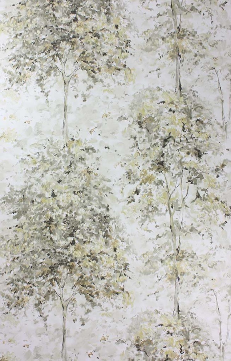 A forest of trees printed in an impressionist style. Shown in the sepia grey with aqua highlights. Other colourways Wide width roll. Please request sample for true colour match.