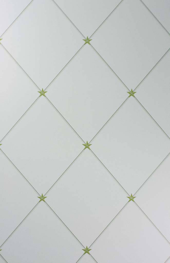 A diamond trellis design with a cool color star stud. Shown in gold on taupe. Other colors are available. Request sample for real color agreement.
