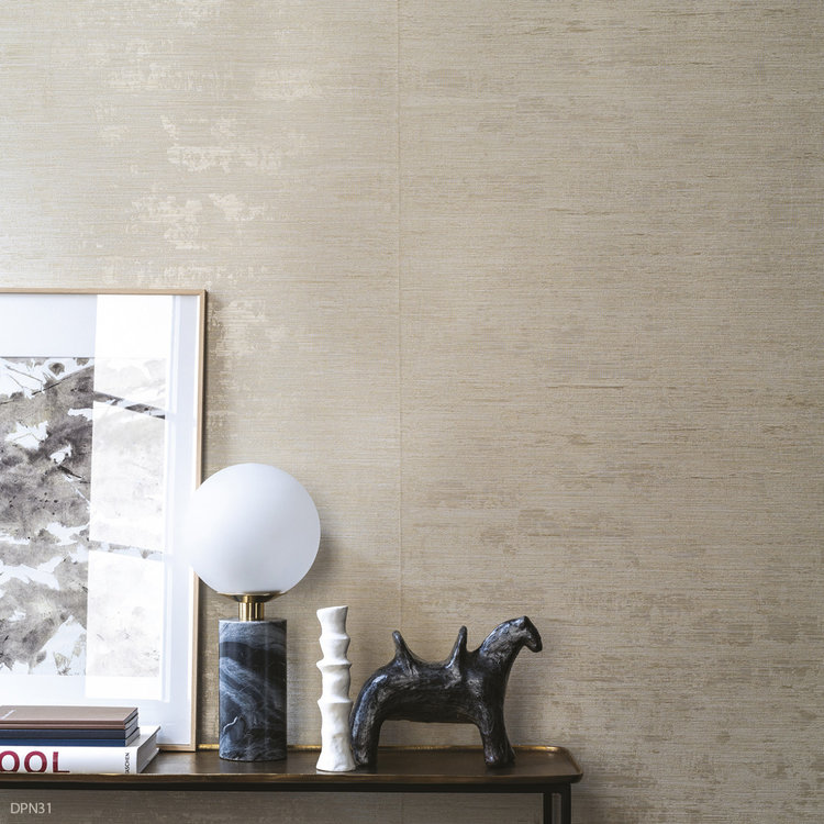 Flair wallpaper pattern has thin, horizontal streaks that give it a woven appearance. It's available in soft, neutral, and metallic colors, and it has speckles that add realism to the look.