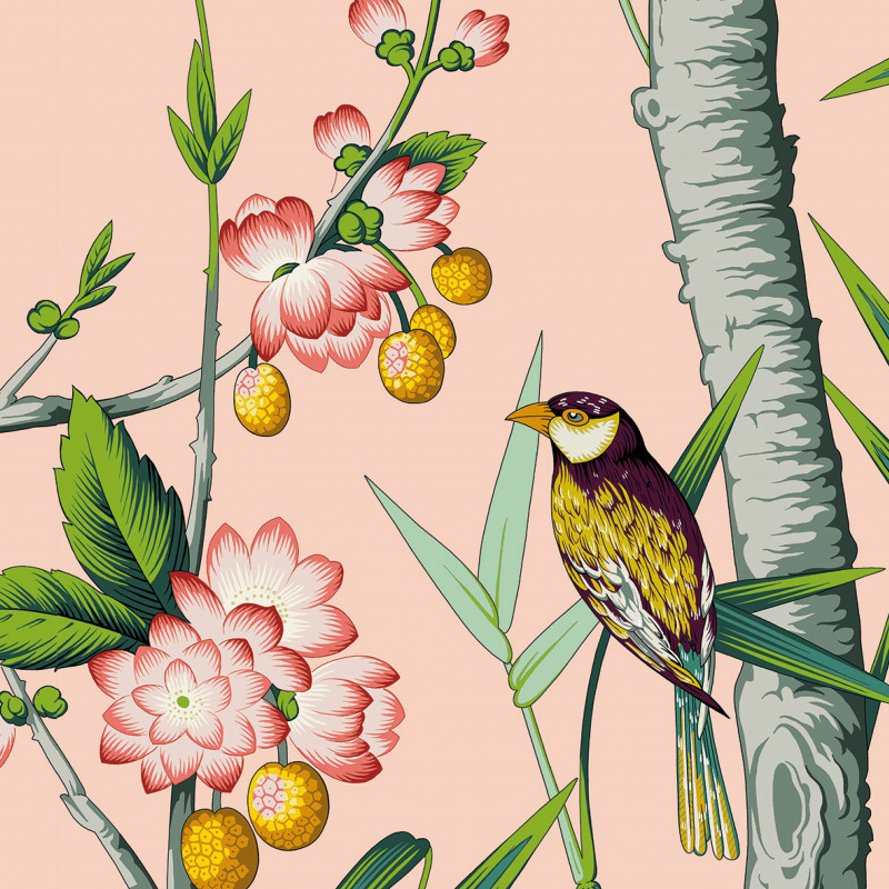 With Joséphine, Nobilis revisits a large classic wallpaper design, offering bold and contemporary colors, printed on Japanese straw. Birds with colorful plumages rest in the shade of bamboo and a tree with flowers and exotic fruits. A roll is made up of 2 strips of 70 cm x 340 cm, i.e. a complete panorama of 140 cm x 340 cm.