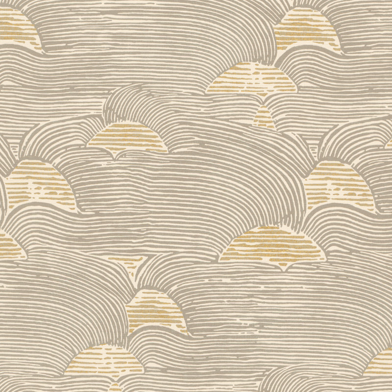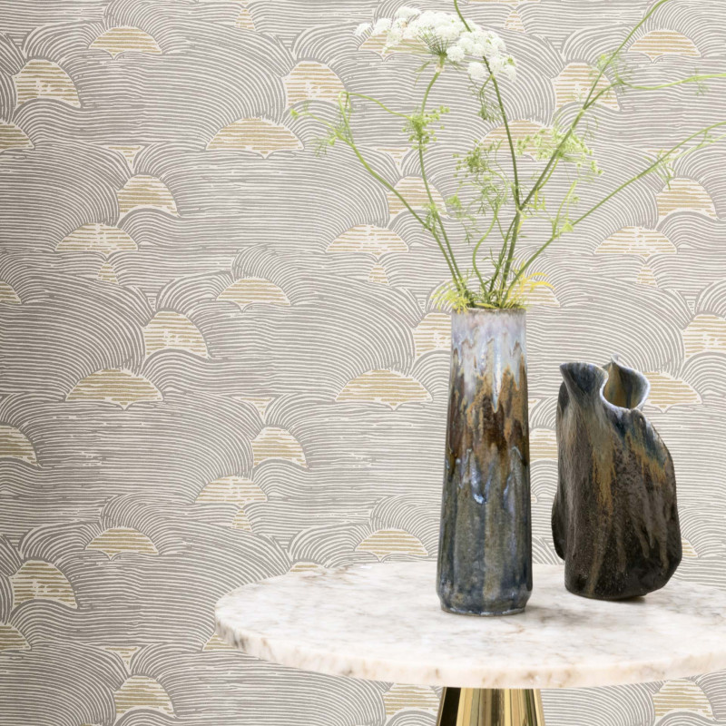 Sunrise wallpaper embossing emphasizes its dreamlike abstract landscape delicately. This freehand drawing of a wave, cloud, and sunset comes in pastel and muted tones, with metallic shines adding matter and relief.