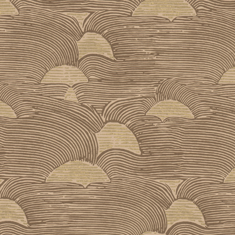 Sunrise wallpaper embossing emphasizes its dreamlike abstract landscape delicately. This freehand drawing of a wave, cloud, and sunset comes in pastel and muted tones, with metallic shines adding matter and relief.