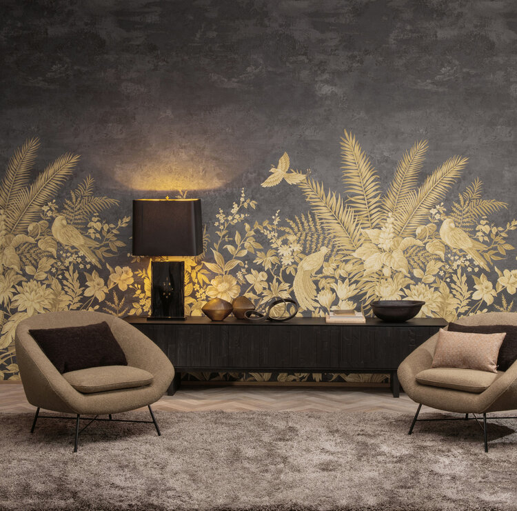 Barraband's Garden wallpaper shows a panorama of exotic flowers, lush leaves and beautiful birds on a light or dark background. This Omexco wallcovering, from the Birds of Paradise collection, is a special wallpaper that is perfect for an exotic, exclusive and maximalist interior.
