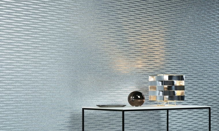 Add glamor to your interior with the Omexco Graphite mica wallpaper. This wallpaper has a background of metallic foil covered with stripes of mica, which run from and towards each other.