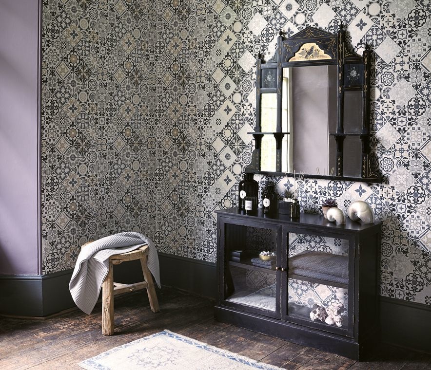 Ornate tile motifs printed with metallic accents. Named after an ancient hilltop village in Liguria