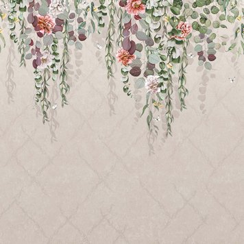 Blooming eucalyptus intertwines with peony blossoms and tiny white butterflies. The foliage falls on a textured wall, the leaves shadowing a delicate ombrÙ of color and a subtle trellis that collapses and collapses.