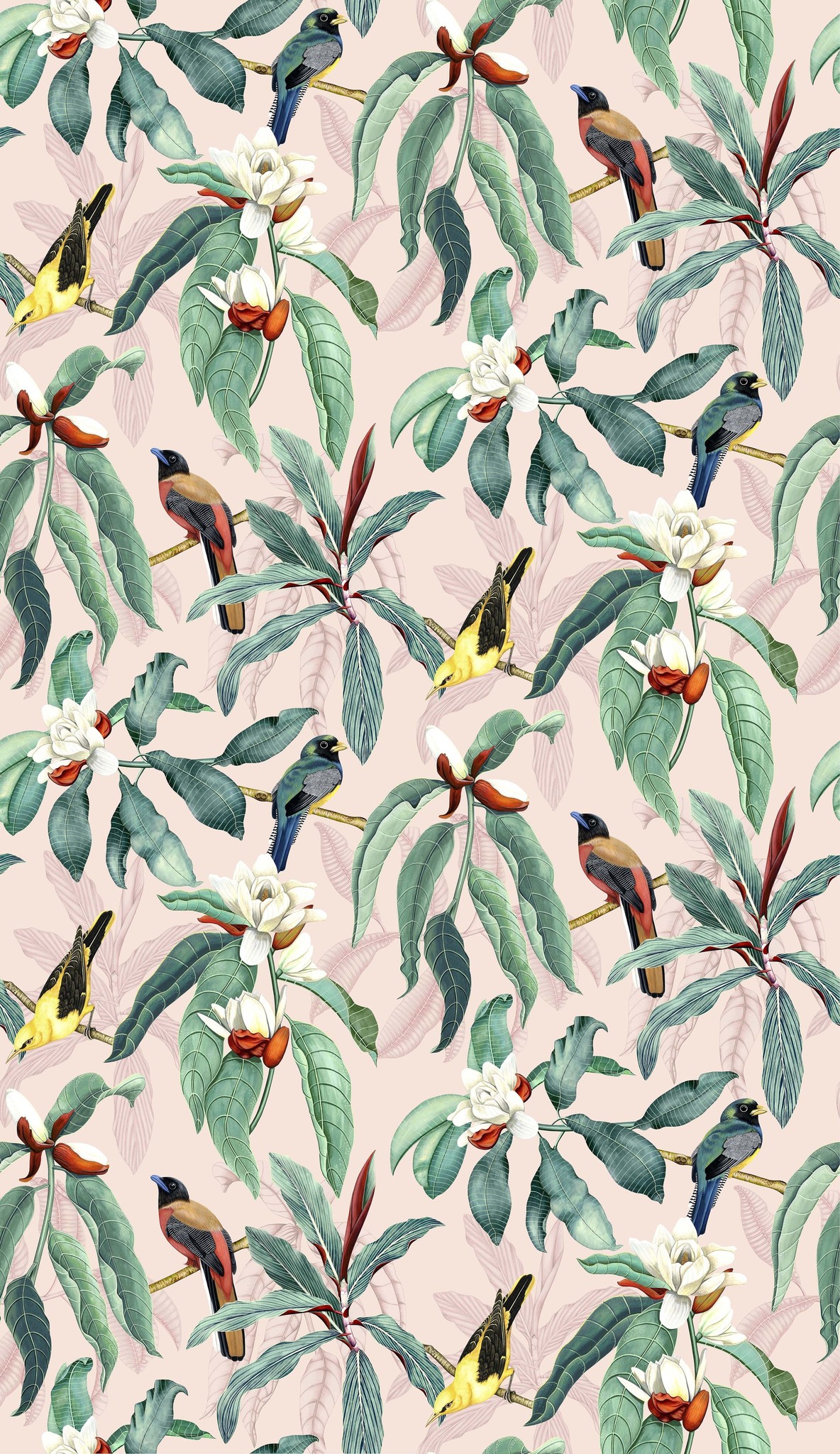 Exotic birds sit in the branches of a magnolia tree with budding flowers. The design is painted in watercolor, with pencil-drawn leaves in the background shading the foliage. Michelia is a variety of magnolia flowers.