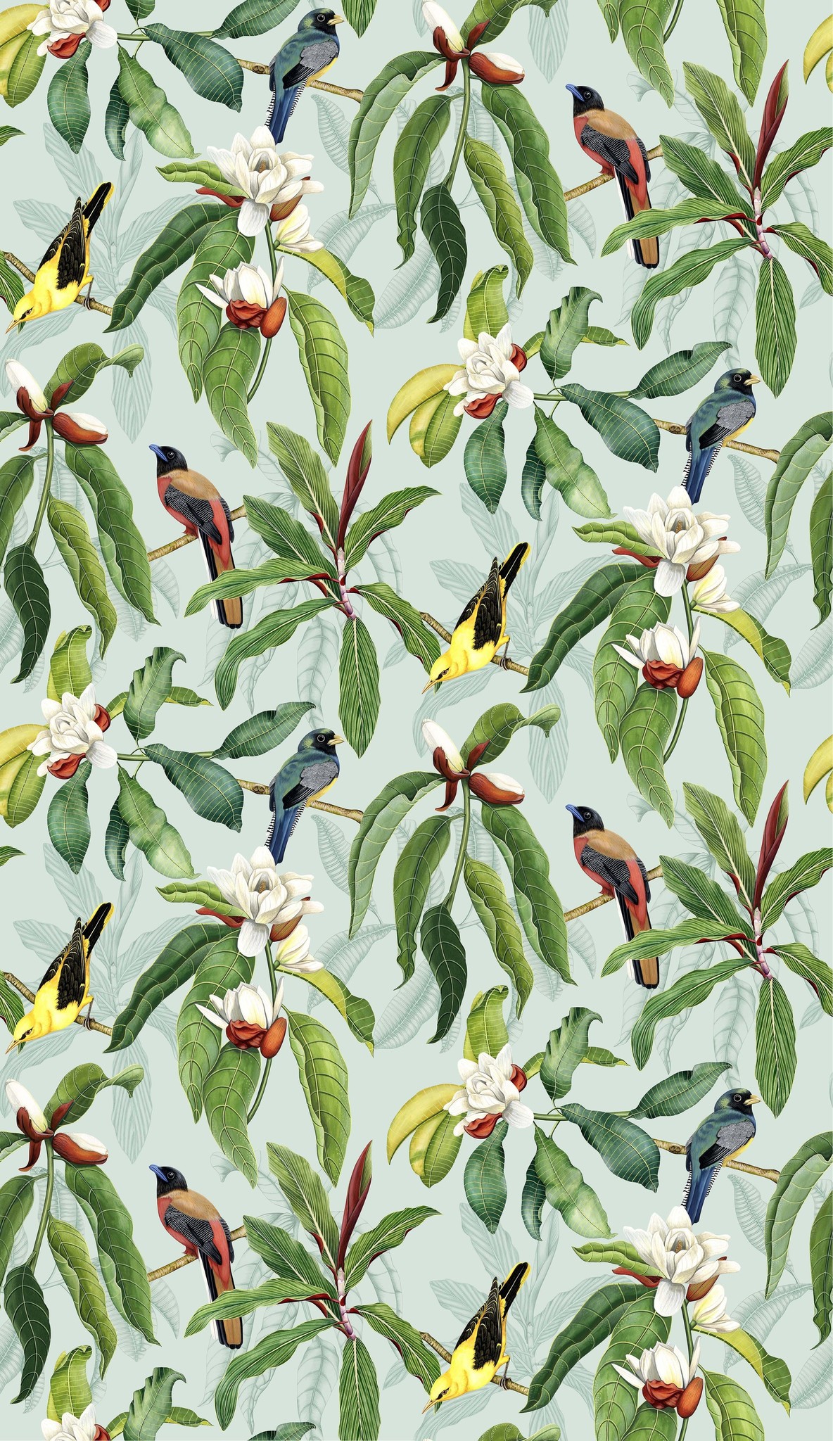 Exotic birds sit in the branches of a magnolia tree with budding flowers. The design is painted in watercolor, with pencil-drawn leaves in the background shading the foliage. Michelia is a variety of magnolia flowers.