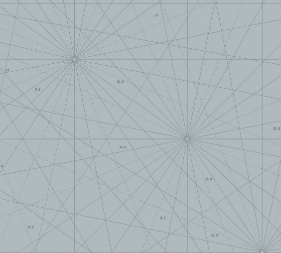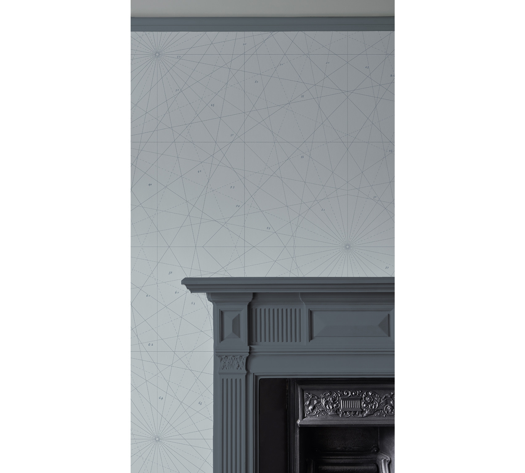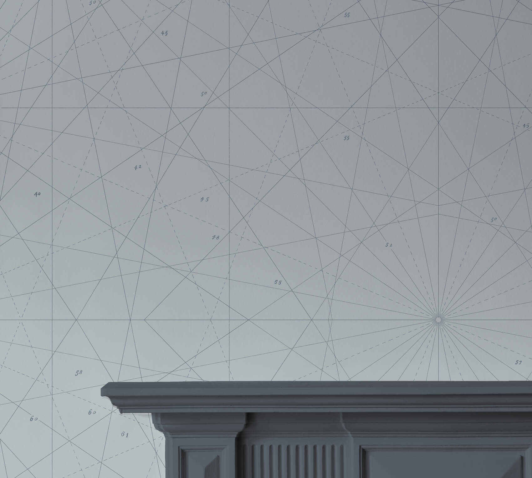 A large-sized mural, which on closer inspection depicts the lines of nautical charts. The motif is inspired by one of the antique nautical charts found in the Dorrien-Smith home in Tresco. The map has been carefully processed into wallpaper, with the nautical fathoms remaining true to the original and the map itself matching the seascape of Tresco. This bold geometric pattern is colored in three shades with one predominant color as the central tone.