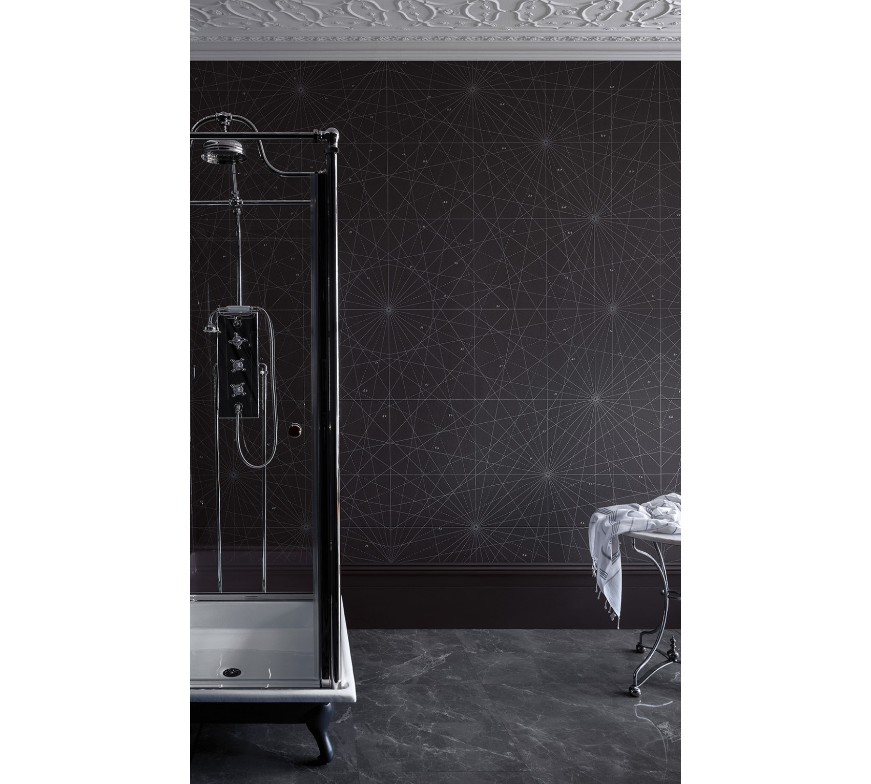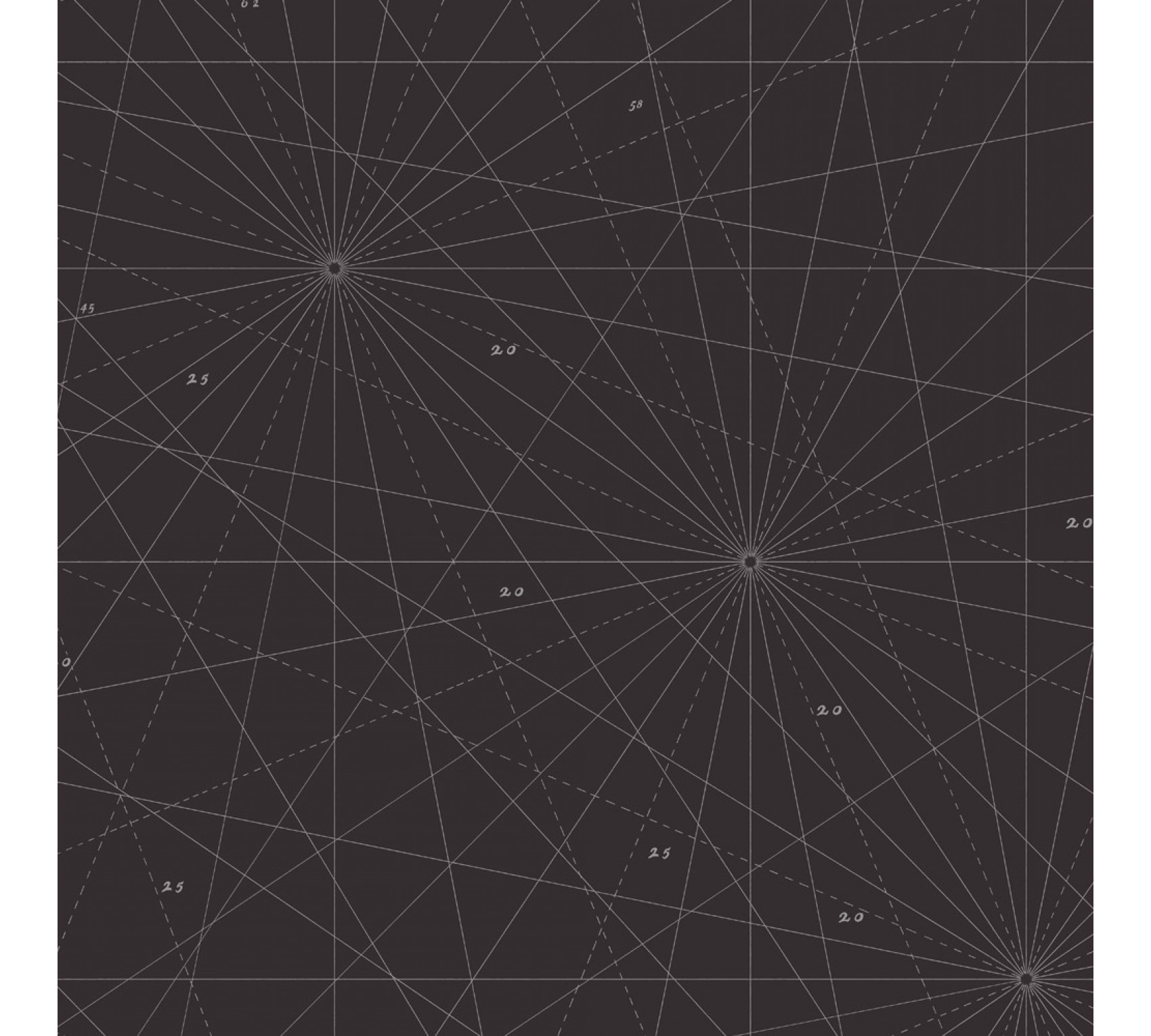 A large-sized mural, which on closer inspection depicts the lines of nautical charts. The motif is inspired by one of the antique nautical charts found in the Dorrien-Smith home in Tresco. The map has been carefully processed into wallpaper, with the nautical fathoms remaining true to the original and the map itself matching the seascape of Tresco. This bold geometric pattern is colored in three shades with one predominant color as the central tone.