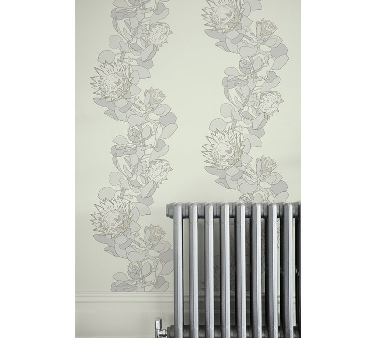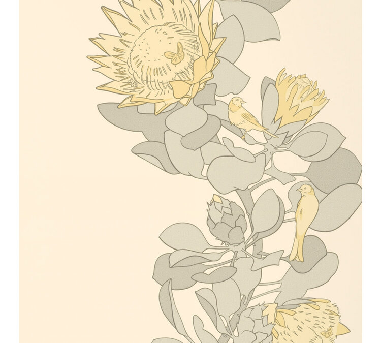 A classic walking path with the impression of a "loose stripe", with proteas, birds and butterflies on a flat surface. Like the island of Tresco itself, these trails contain a complete ecosystem of inhabitants. This organic stripe design combines a range of original and architectural colors to create strong contrasts and subtle accents within the track. This paper is flexographically printed and has a smooth, flat finish, giving a traditional style a more contemporary look.