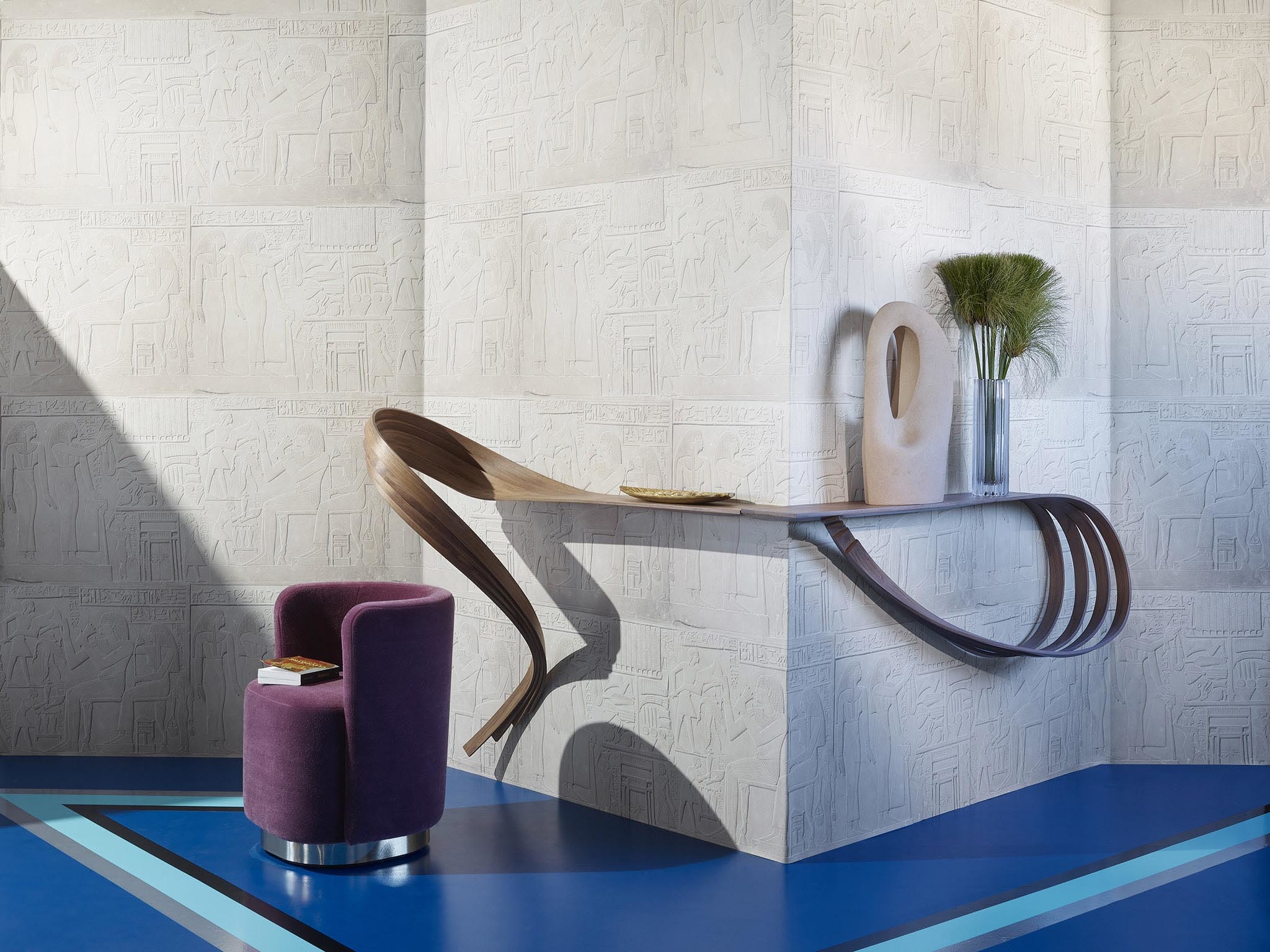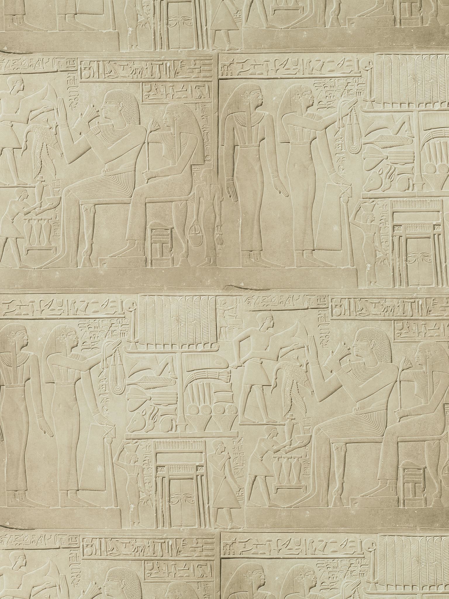 This wallpaper illustrates with realism an extract of the decoration of the funeral stele of Abkaou. He is represented with his wife receiving offerings. Other scenes evoke the rites celebrated during the feasts of Osiris. The 3D printing retranscribes in an unprecedented way the relief and the details of this limestone stele. Discovered in Abydos, this piece is kept in the Department of Egyptian Antiquities at the Louvre