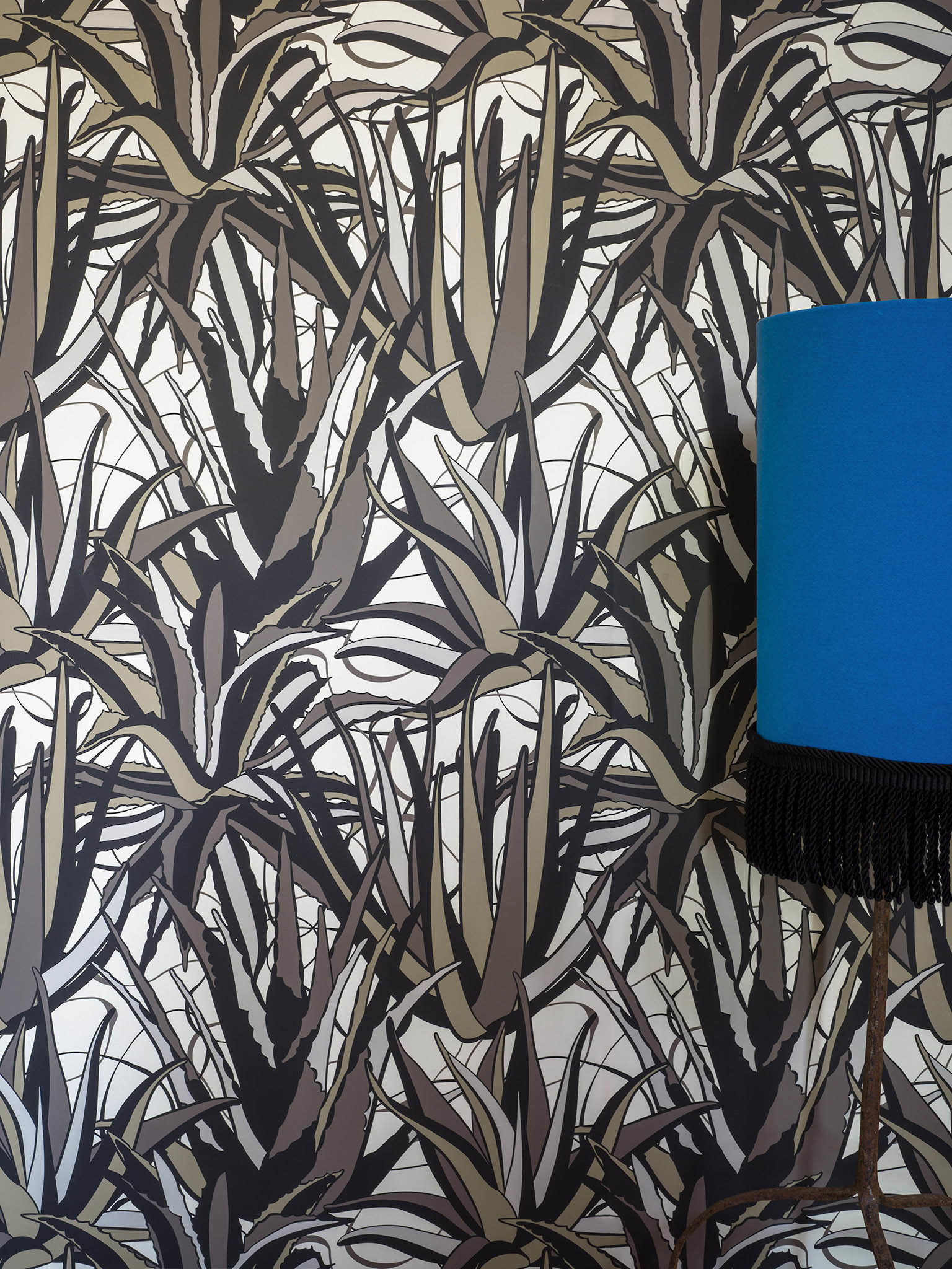A graphic and contemporary version of a Mediterranean garden where agaves and succulents are tangled. The traditional printing matte and smooth brings softness and elegance to the colors.