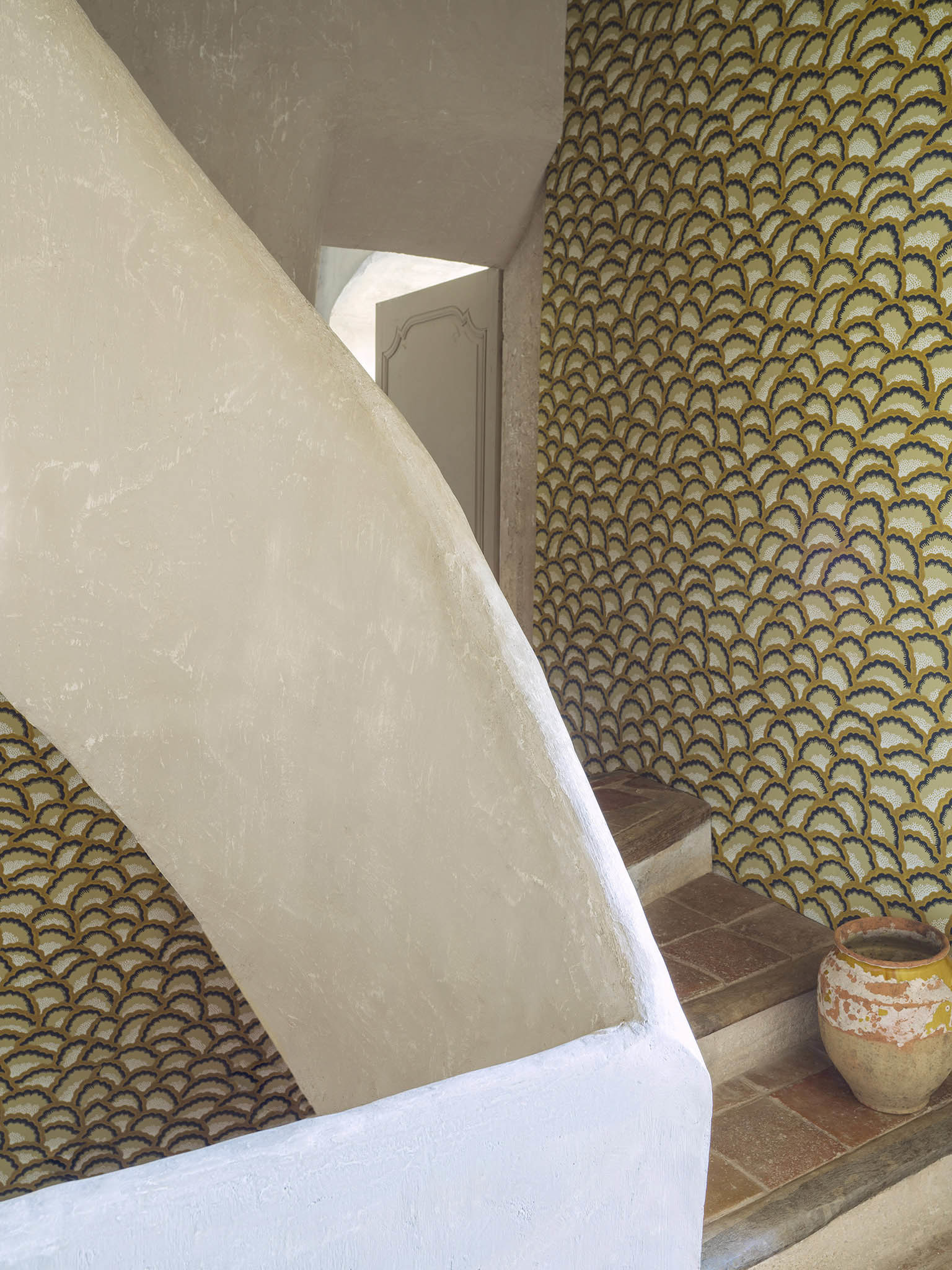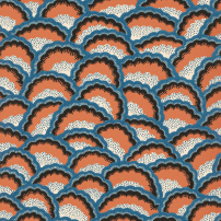 Timeless pattern with refined colours and printed using a traditional printing technique with a hand-painted effect, ARLESIENNE from the archives of Maison Pierre Frey recalls the quilted petticoats of Arles city.