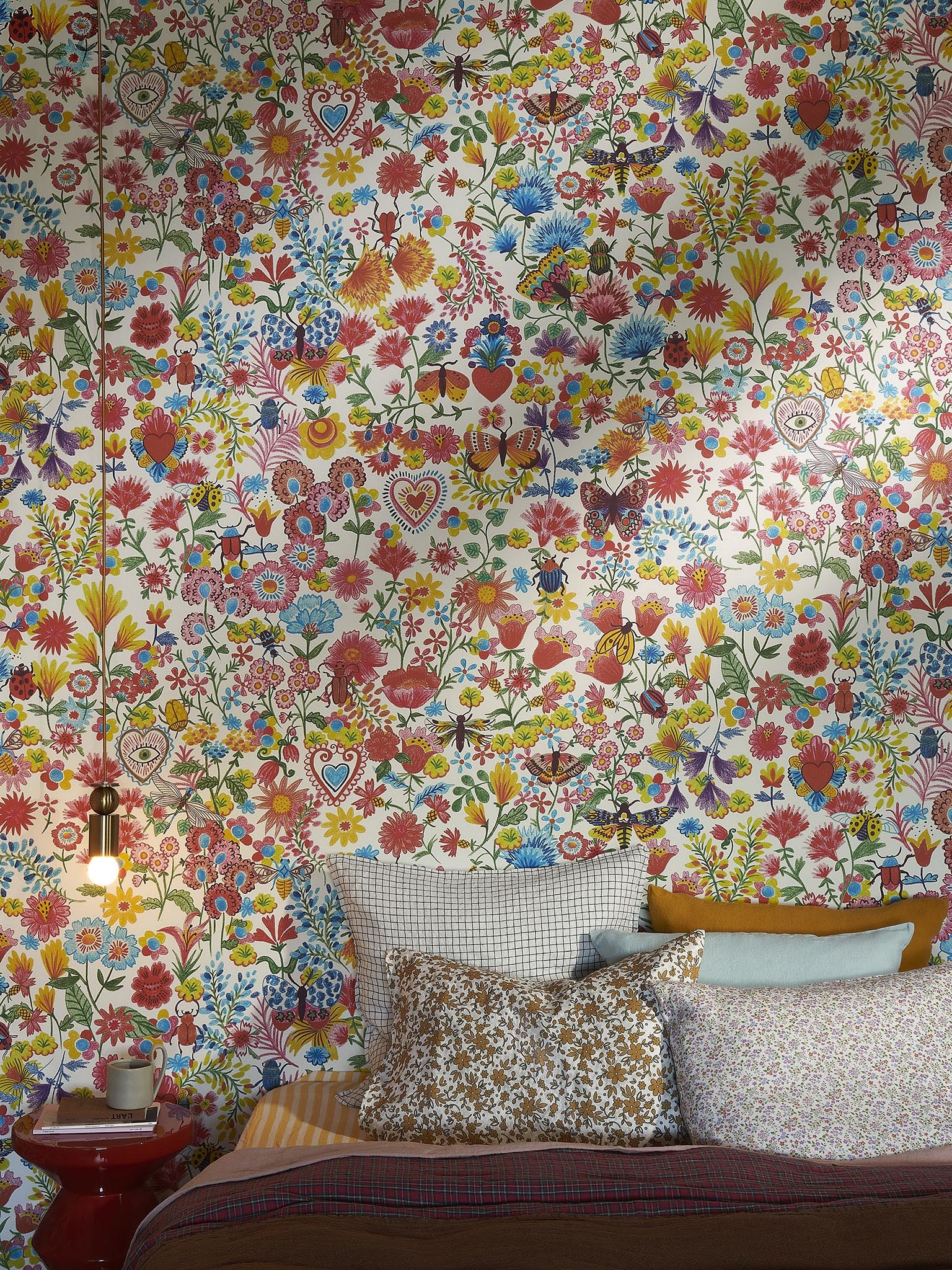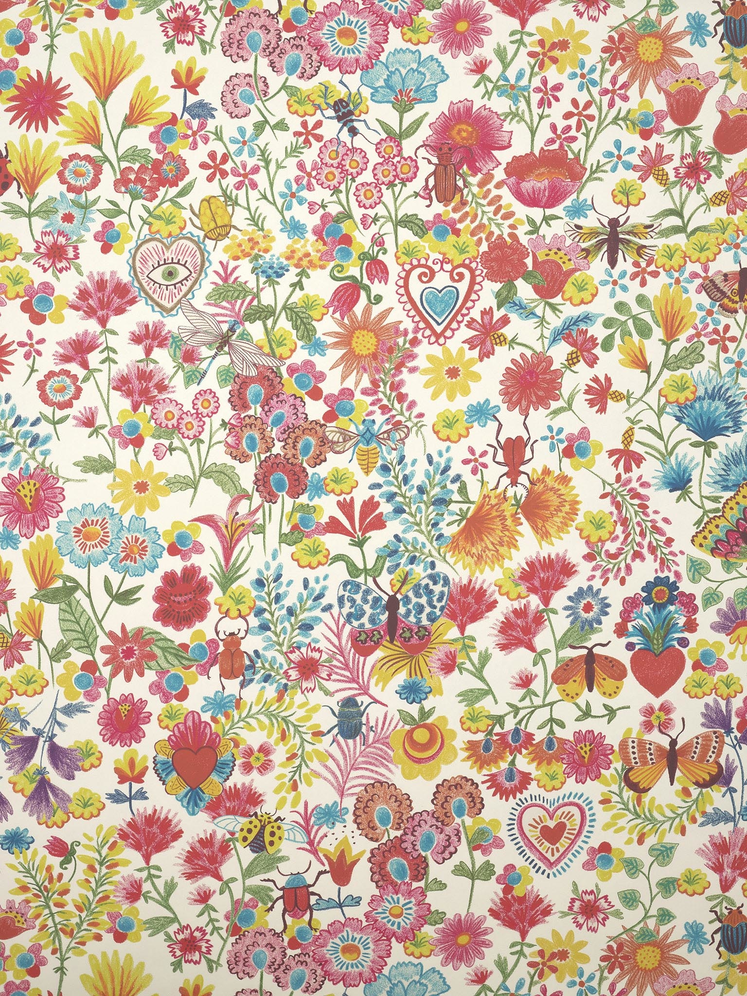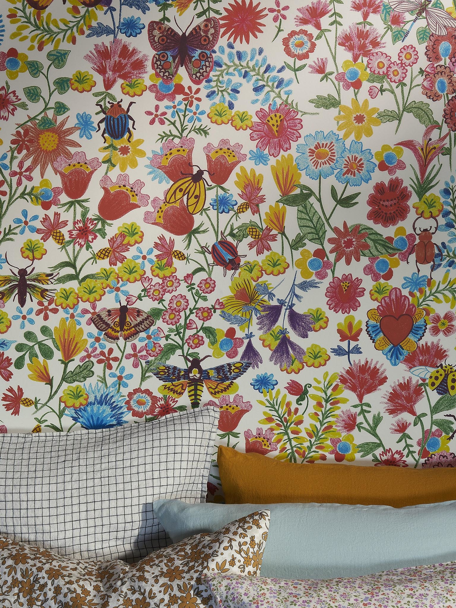 Camomille is a wallpaper created by artist Camille Gressier. This wallcovering by Pierre Frey from the Les Dessins 6 collection shows a pattern realized with colored pencils and oil pastels, full of flowers, butterflies and hearts. A graphic wallpaper that is perfect for a cheerful, colorful and lovely interior.