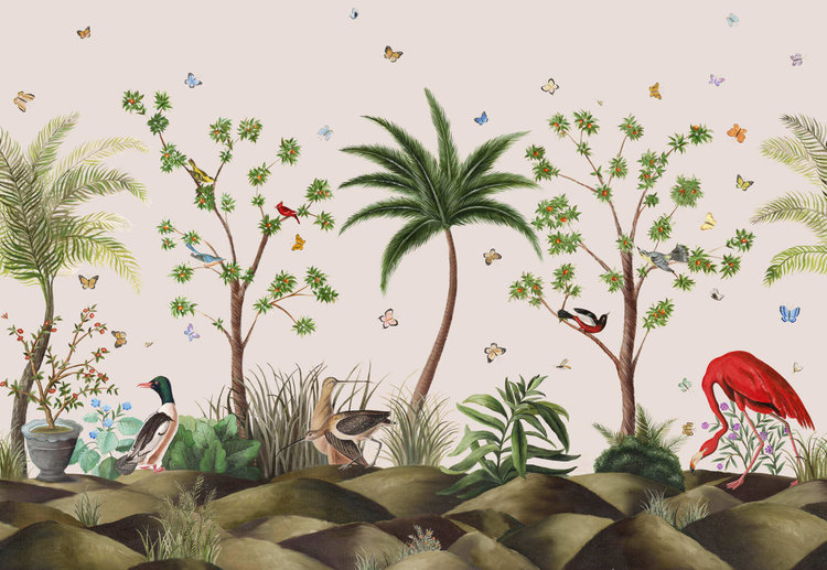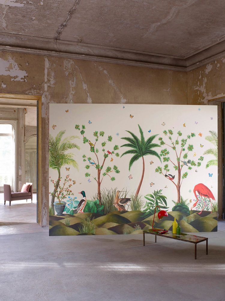 An exotic scene by Carlos Mota where butterflies, colorful birds and flamingos flit between palms and orange trees. A soft, realistic masterpiece, hand painted and printed on a vinyl with raw silk effect, offering character and relief.
