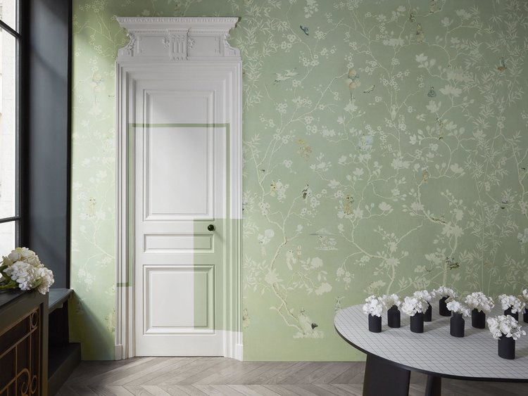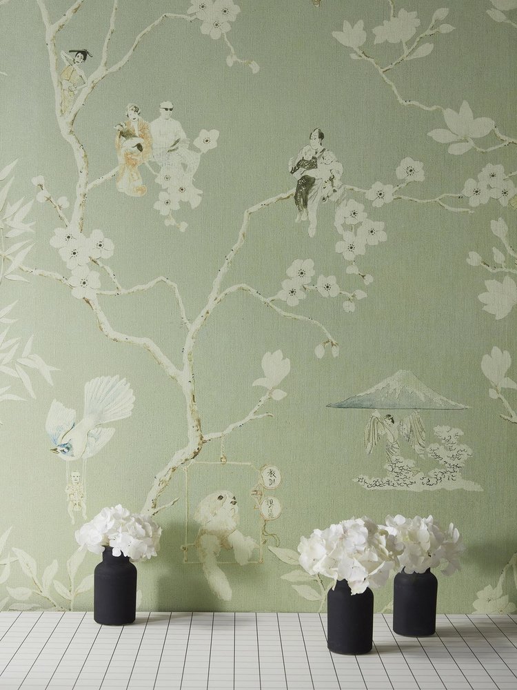 Japonaiserie revisited, this stunning composition was created to dress the bedroom walls of the daughter of Alexandre de Betak, art director, producer, scenographer and designer. This combination of traditional Japanese inspiration combines a collage of selected images with surreal elements staged in the manner of Hiroshige and Hokusai (19th century Japanese Edo painters).