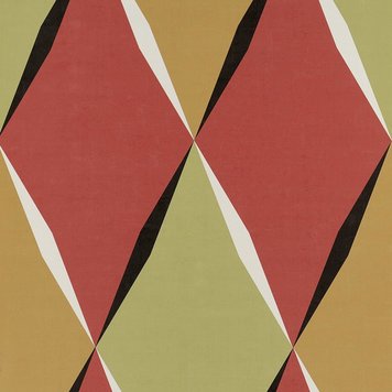 Large geometric pattern composed of lozenges whose scale and combination of colors bring volume and depth to the wall. Printed on an embossed vinyl with an unstructured linen look and a matte finish.