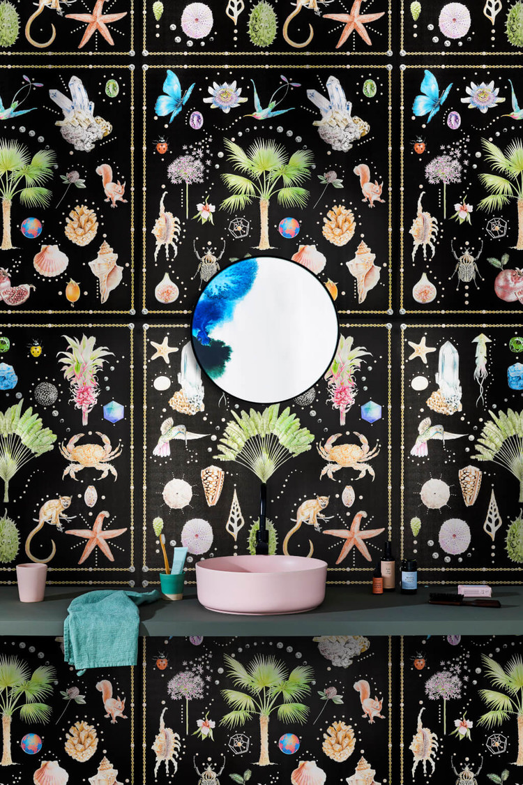 Like a cabinet of curiosities, a variety of hand-painted designs wind around a central tree. The overall composition recalls a silk scarf.