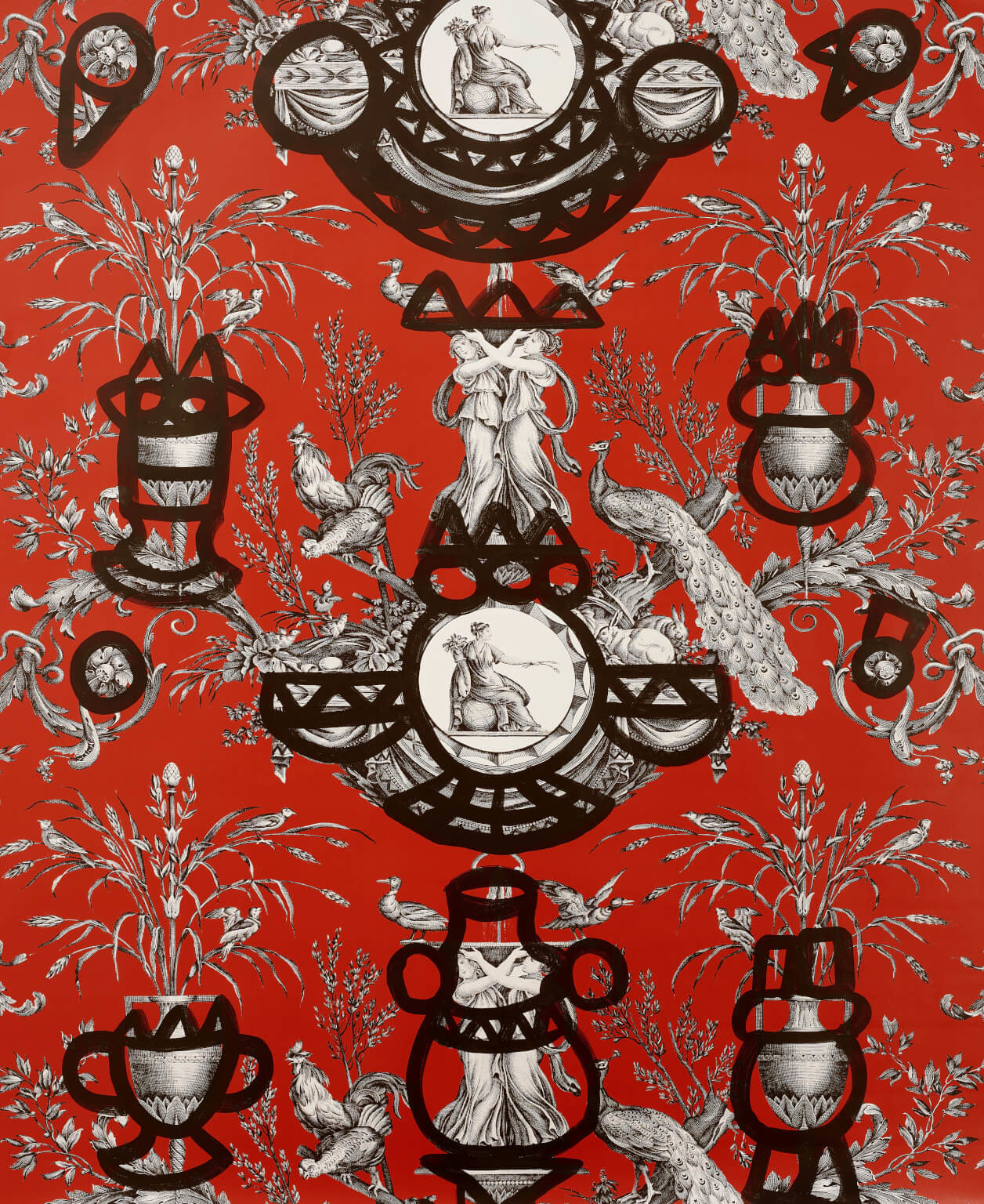 Christian Astuguevieille has reimagined this iconic fabric designed by Jean-Baptiste Huet, which is housed in our archives. It was printed in 1803 at the Oberkampf manufactory in Jouy-en-Josas using the copperplate technique. The design's scale has been altered, and the original latticework on the background has been replaced by flat areas of color in the artist's own shades. A contemporary approach thus enhances the Neoclassical motif.