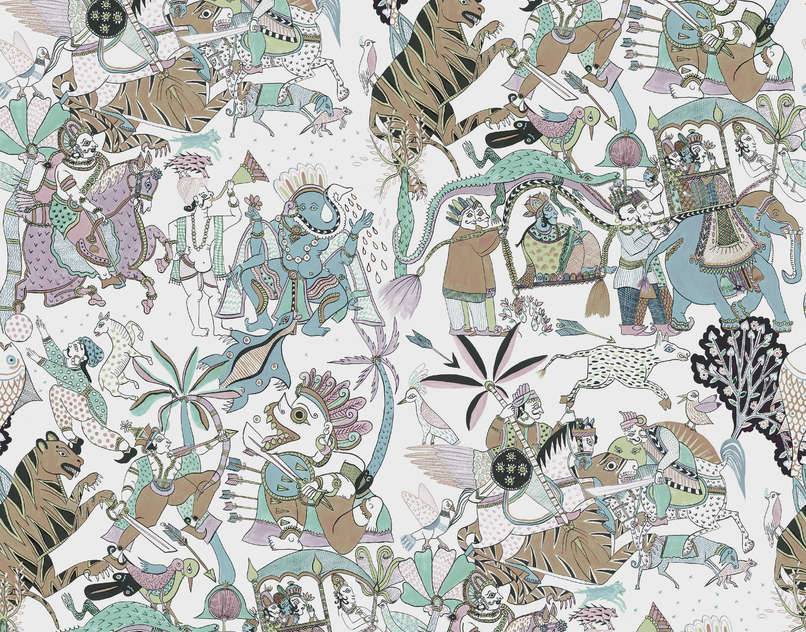 A Hindu daydream that narrates the Mahabharata, one of the major epics of ancient India. A procession of various characters and animals decorated with jewelry and colored patterns, among them is Harishchandra, legendary Indian king, and Ganesha, the god of good fortune. Printed in an extra wide format, this work of art was drawn entirely by hand with a feather and Indian ink.
