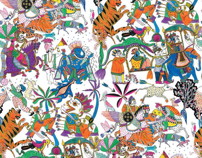 A Hindu daydream that narrates the Mahabharata, one of the major epics of ancient India. A procession of various characters and animals decorated with jewelry and colored patterns, among them is Harishchandra, legendary Indian king, and Ganesha, the god of good fortune. Printed in an extra wide format, this work of art was drawn entirely by hand with a feather and Indian ink.