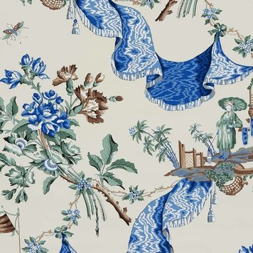 This wallpaper reproduces a motif known as "The Drapery" and is printed on cotton with the copper plate technique around 1795 by the Nantes-based manufacturer Favre, Petitpierre and Cie. It harmoniously unites a Chinese figure with a parasol and a bouquet embellished with a drapery in a theatrical style. Perfect illustration of French chinoiserie art where the iconographic European and Chinese elements are mixed together. Screen printing by hand.