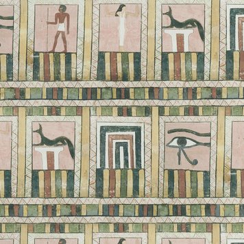 This wallpaper reproduces the decorations of the coffin of a woman discovered in the cemetery of Gournet Murraï and used during the reign of Hatshepsut, wife of the pharaoh Thutmose II, who became pharaoh herself after the death of her husband during the New Kingdom. It shows a man in a loincloth, a standing woman and a representation of Anubis and the eye of Udjat, a protective symbol.