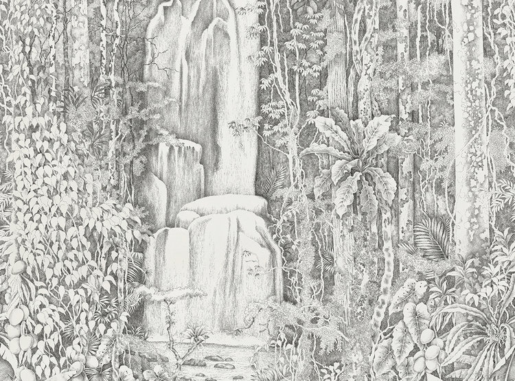 Enter the jungle and observe its many details. Fruits, passion flowers, vines and banana trees surround a waterfall in this garden of eden. This hand-drawn illustration is made in a pointillist monochrome. Printed on a matte, non-woven material.