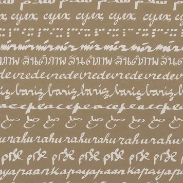 The word Peace translated into several languages on natural media procures total peace of mind with respect to Clara Halter's design.