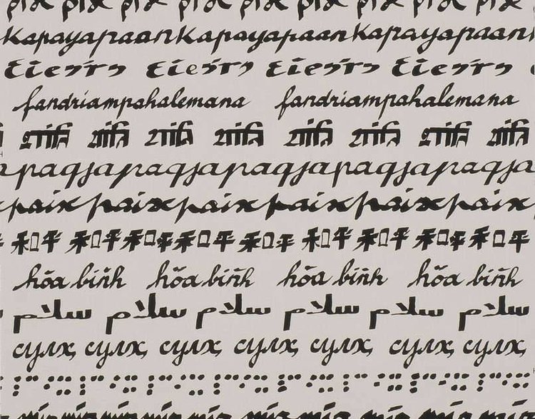 The word Peace translated into several languages on natural media procures total peace of mind with respect to Clara Halter's design.