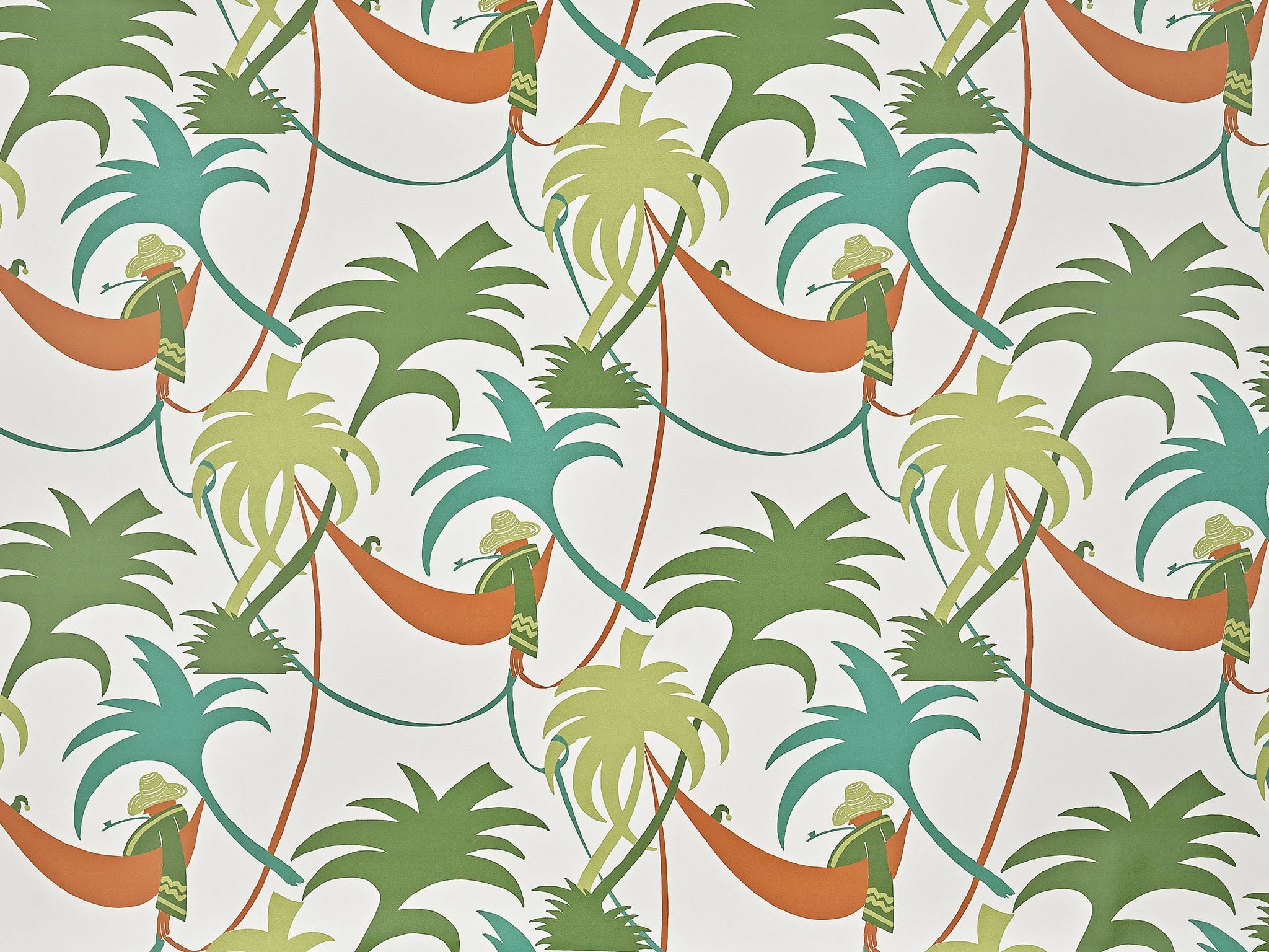 La Siesta is a wallpaper inspired by afternoon naps in the Mediterranean. This wallcovering by Pierre Frey from the Les Dessins 6 collection has a pattern full of palm trees, hammocks and sleeping figures. A graphic wallpaper that is perfect for a cheerful, colorful and expressive interior.