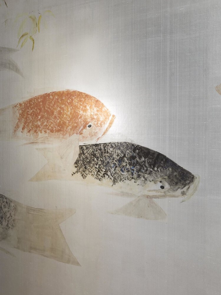 Red and silver carps seem to swim peacefully under the bamboo. A treasure found in a London antique shop, the Chinese screen from which the panoramic design is derived is breathtakingly beautiful! The choice of the silk and lurex support reflects the light and reproduces with authenticity the charm of the original silk painting.