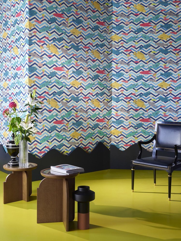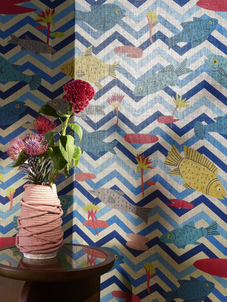 The artist Louis Barthélemy illustrates in a contemporary and graphic way the fish of the Nile and their reflections. The bright or precious colors are enhanced by the printing on a metallic linen background laminated on a non-woven backing.