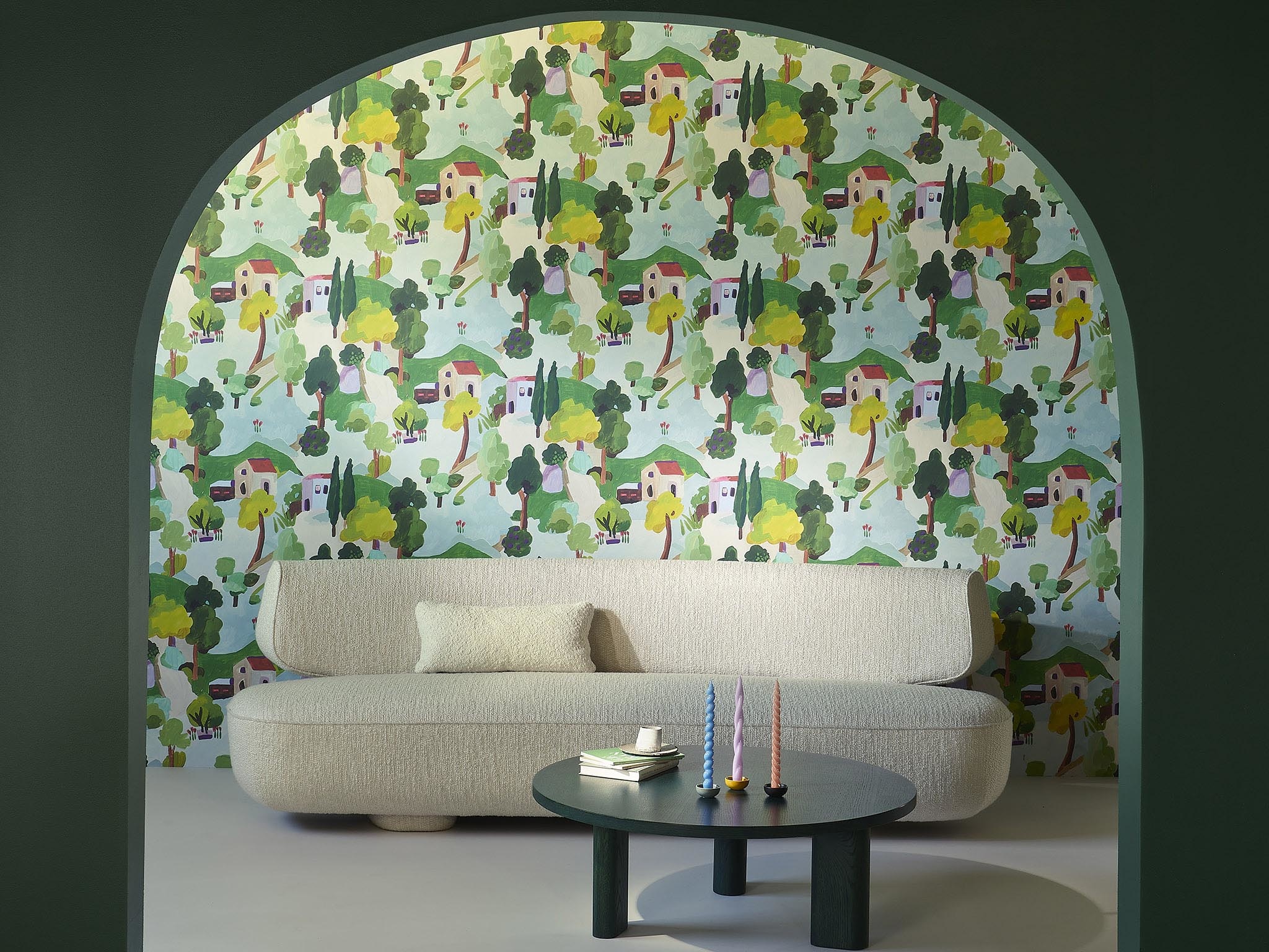 L'Arbe a Souhaits is a wallpaper inspired by villages in the French countryside. This wallcovering by Pierre Frey from the Les Dessins 6 collection shows a graphic landscape full of houses, trees, flowers and winding country roads. A cheerful wallpaper that is perfect for an inspiring, colorful and atmospheric interior.