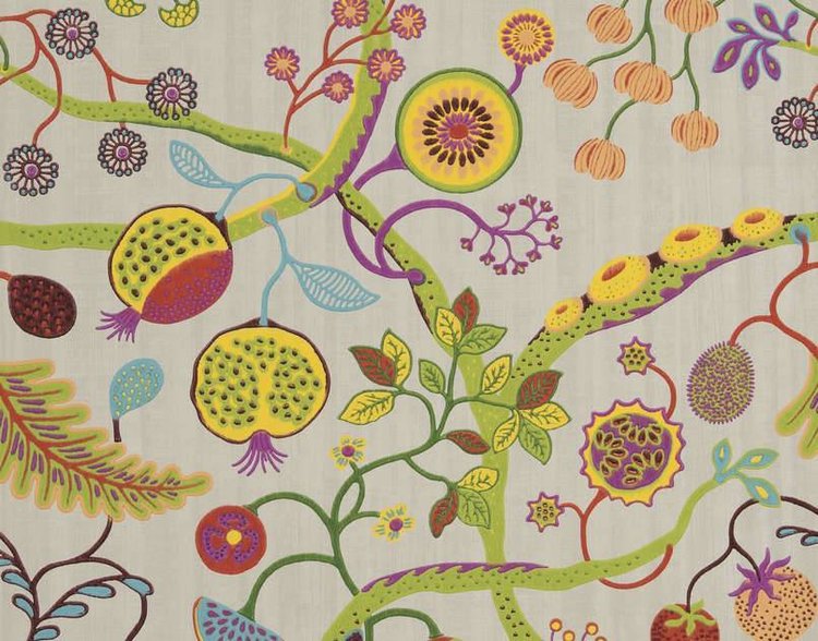Sinuous vegetation filled with flowers and fruits. The abundance and liveliness of the designs create a colourful, magical universe. Hasta la vista! Trimmed.